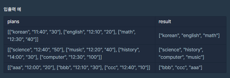 public List<String> solution(String[][] plans) {