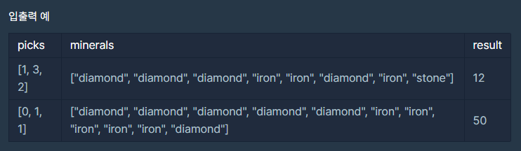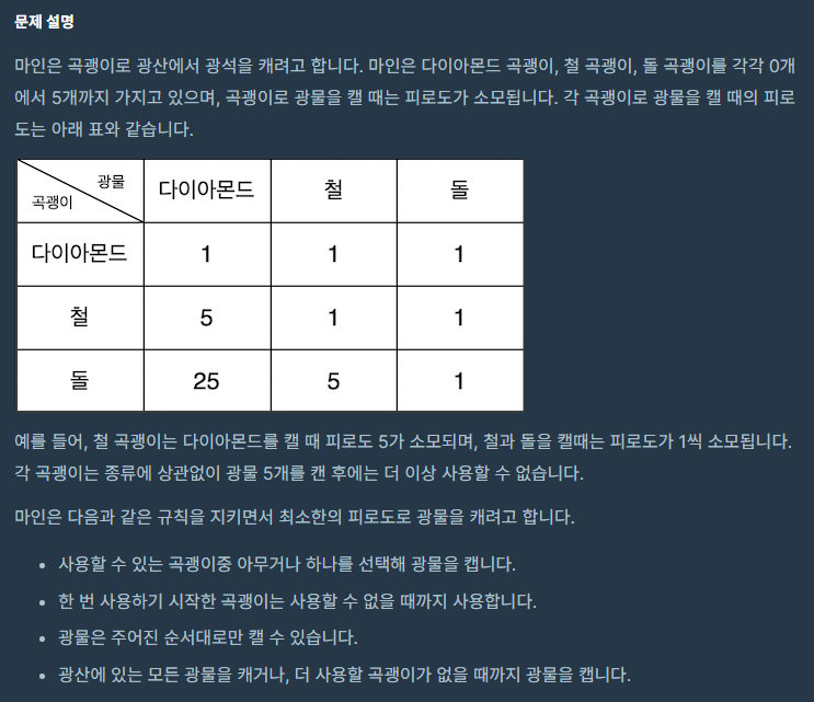 // 가장 피로도가 큰 광물을 가장 좋은 곡괭이로 캐게 됨.