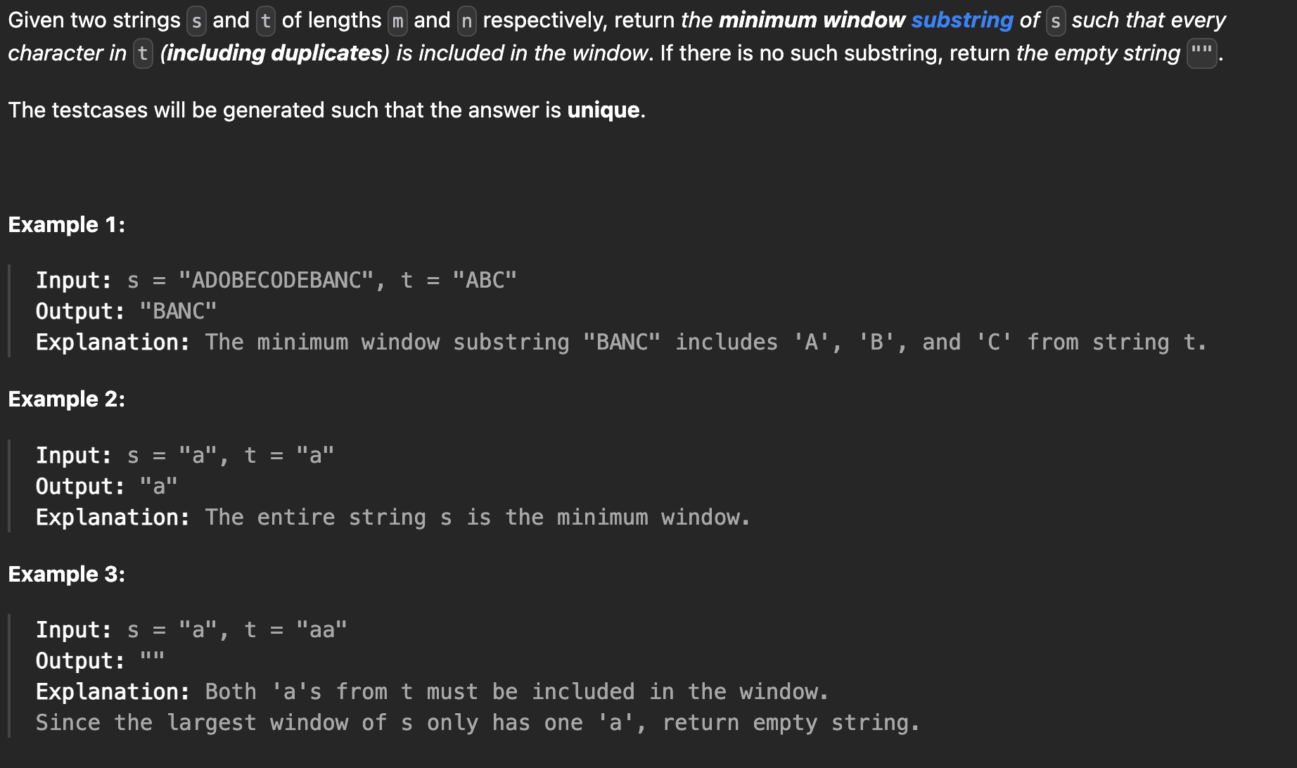 return minLength == Integer.MAX_VALUE ? "" : s.substring(minLeft, minRight + 1);