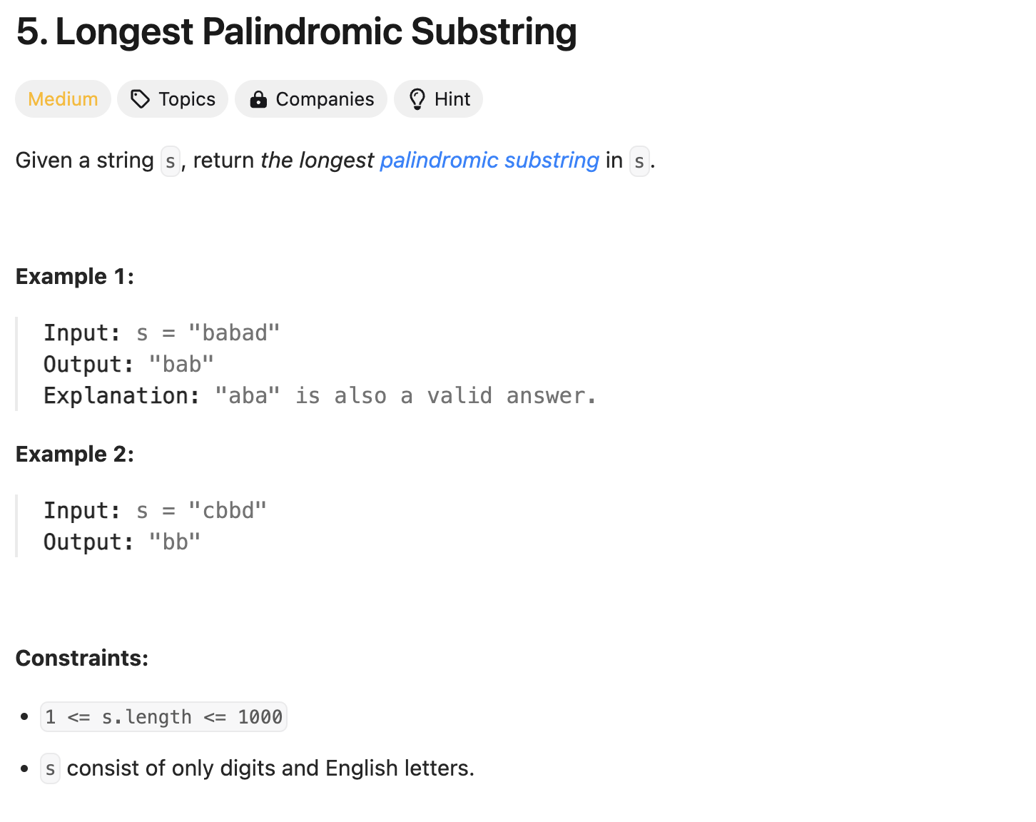 Leet code (Medium): 5. Longest Palindromic Substring (중심확장법)- Java 본문