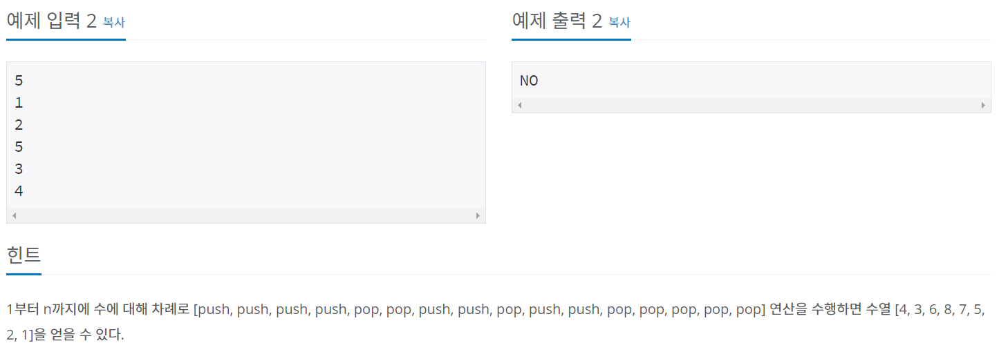 - s.top()과 inp을 비교햇을 때, top이 더 크면 불가능 (pop은 입력된 숫자와 같은 숫자만 가능하기때문)