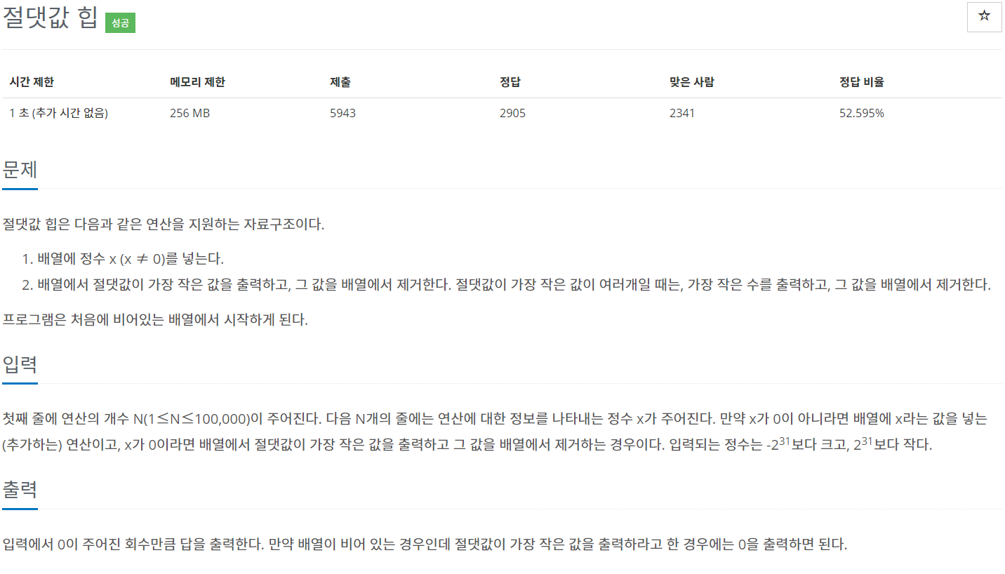 - 절댓값이 같은게 여러개라면 더 작은 수(음수)를 출력, 삭제한다.