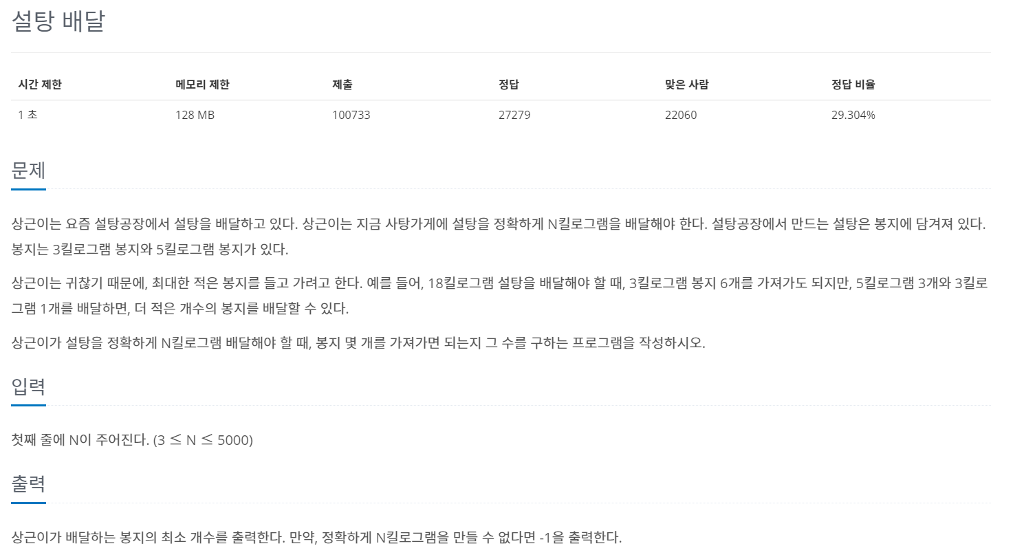 5킬로그램 봉지의 수를 하나씩 늘이면서 나머지 킬로그램을 3킬로그램 봉지가 채울 수 있는지 확인한다.