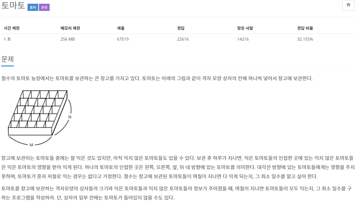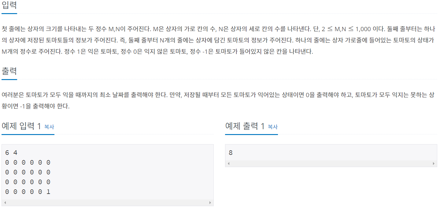 3. 익은상태로 시작하는 토마토가 여러개일 수도 있음 (토마토상태 입력받으면서 deque에 1인 토마토 push 필요)