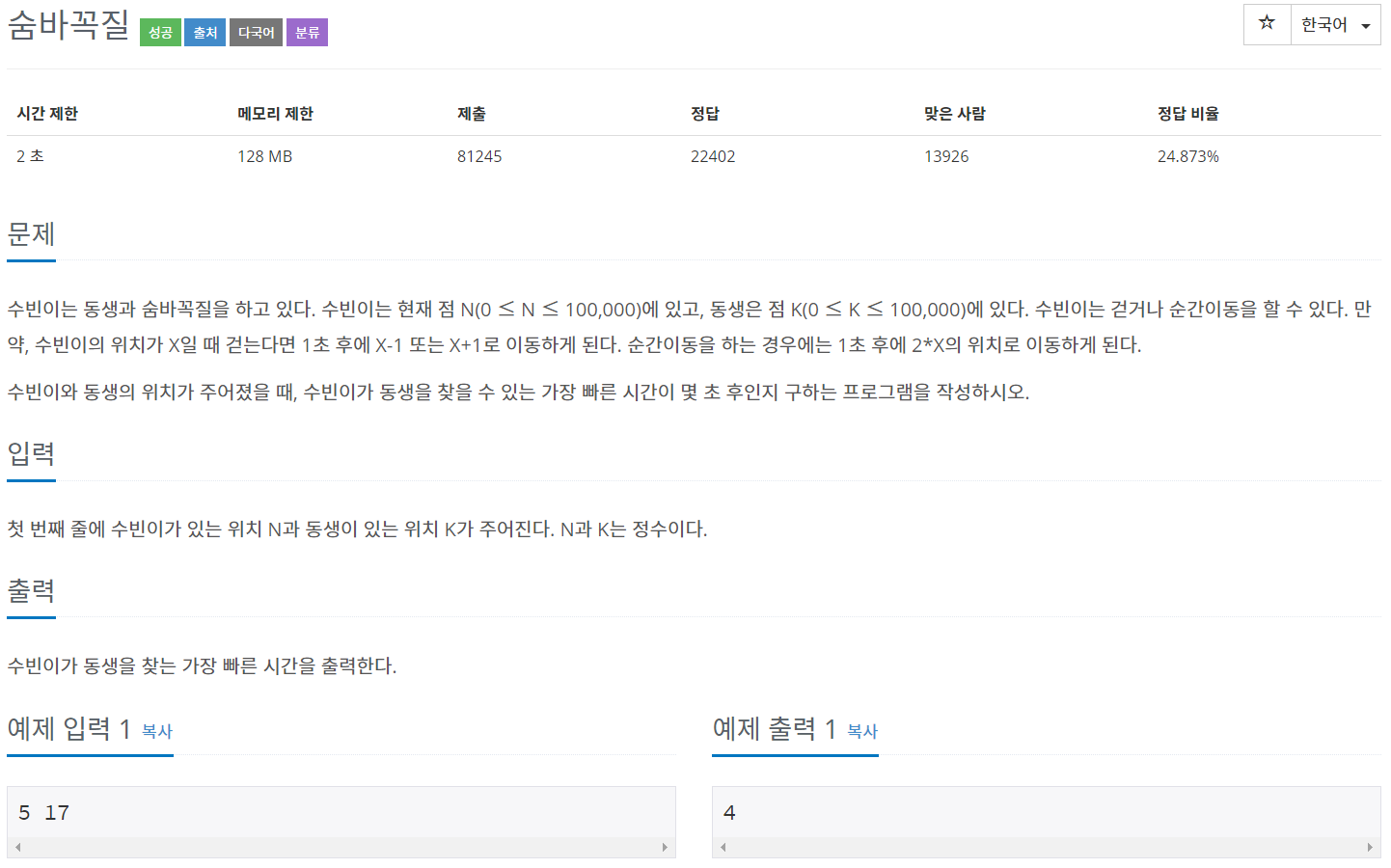 백준 1697번 : 숨바꼭질 [C++] 본문