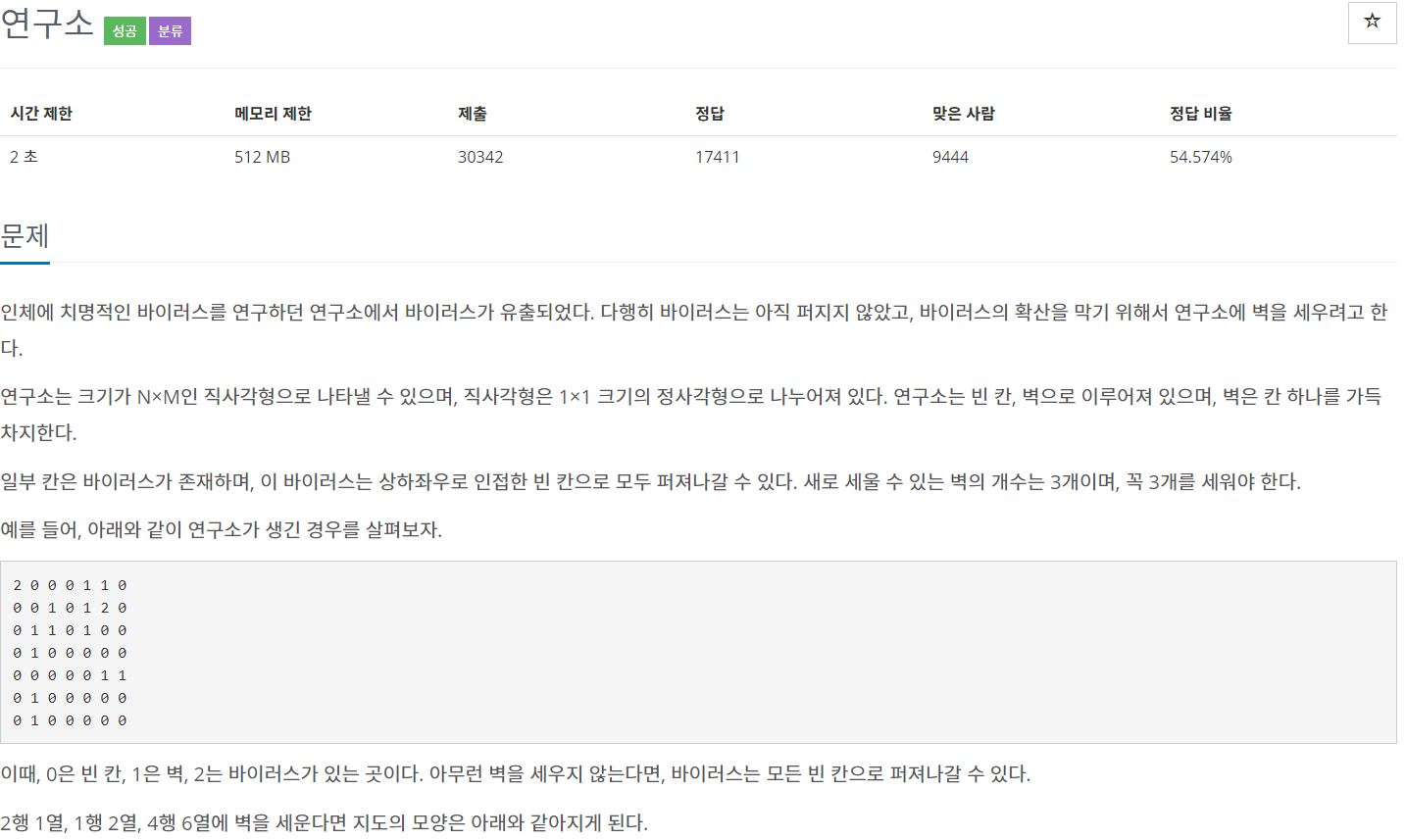 - 벽과 바이러스가 없는 0인 자리에 벽 3개를 세웠을 때의 모든 경우의 수를 따져야한다. ---> brute force