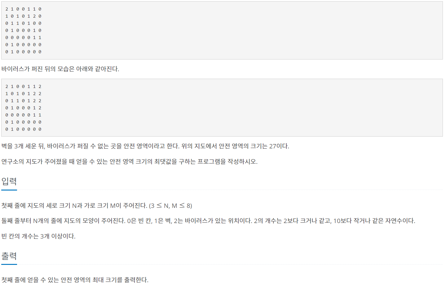 연구소에 세개의 벽을 세운후 퍼진 바이러스의 영향을 받지 않은 영역의 수의 최댓값을 구하는 문제다.