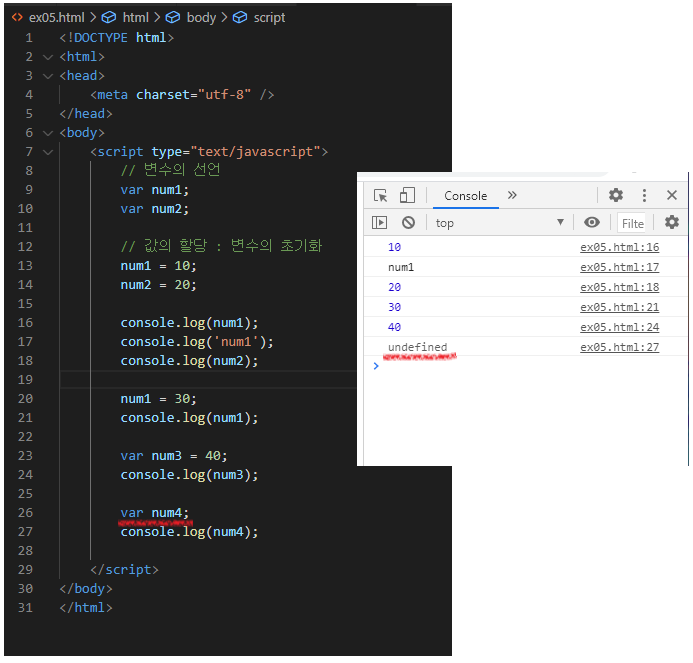 - 선언하지 않은 변수값을 console로 읽으려고 하면 오류가 나지만,