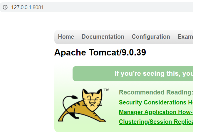 4) 브라우저에서 127.0.0.1:8081으로 열면 로 톰캣화면이 뜨면서 연결이된것을 확인 가능하다.