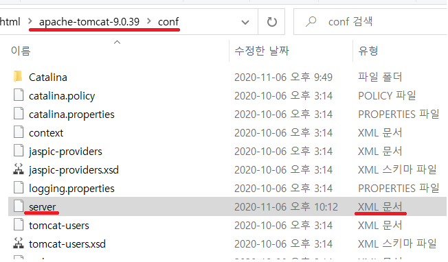 1) 톰캣의 conf폴더에 들어가서 server.xml을 연다.