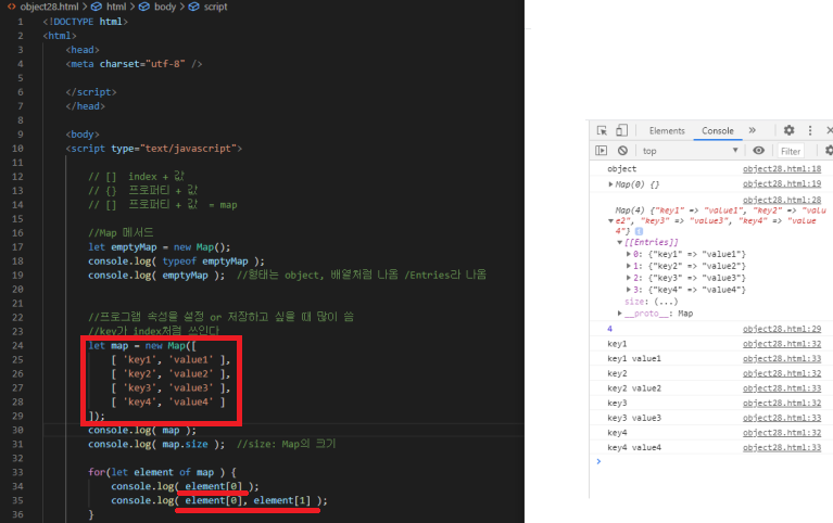 - entries() : Map 객체의 각 요소에 해당하는 [키, 값] 쌍을 Map에 등록한 순서대로 포함한 새로운 Iterator 객체를 반환한다.