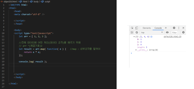 - map : 배열을 1대 1로 짝짓되 기존 객체를 수정하지 않는 메서드.