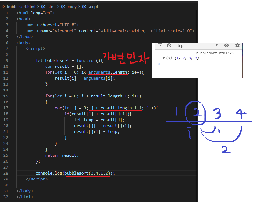 함수 이름: bubblsort(1, 2, 3, 4 ) ->