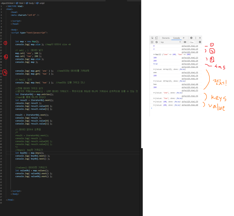 let iteratorObj = map.entries() 를 하여 객체 map의 [키, 값]쌍을 순서대로 iteratorObj에할당.