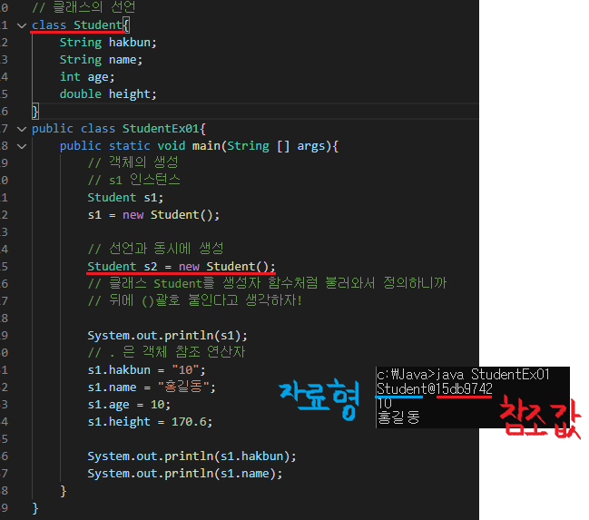 이렇게 객체를 선언하는데 객체는 배열과 동일하게 참조 변수다.