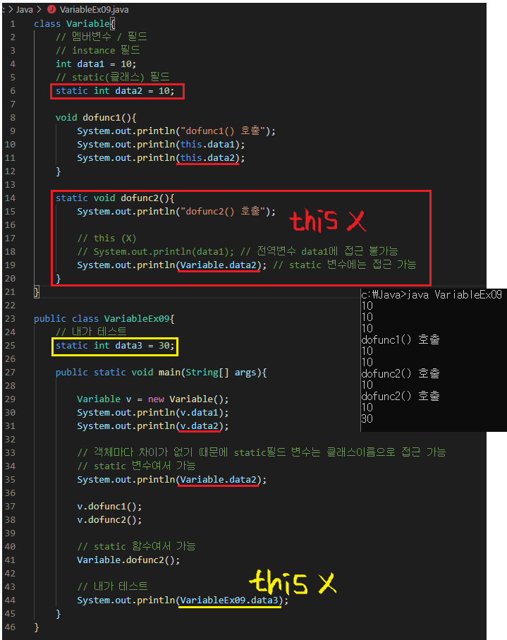- static 내에서 전역변수(멤버변수)를 부르는 것은 불가능