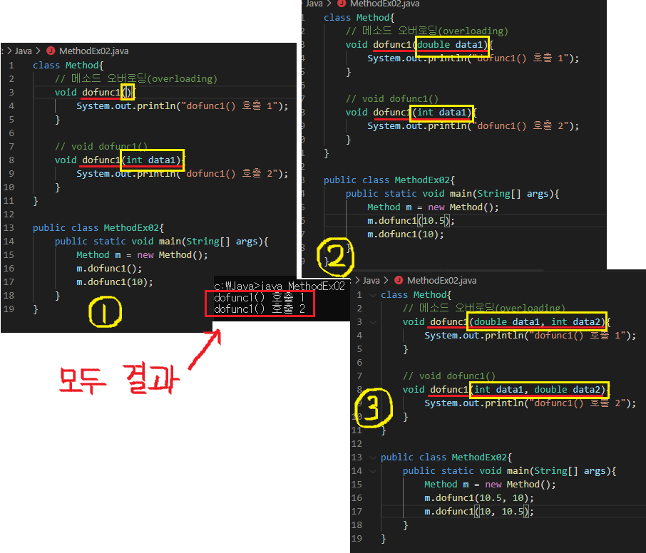 - 메소드 오버로딩의 조건은 매개 변수의 타입, 개수, 순서 중 하나가 달라야한다.