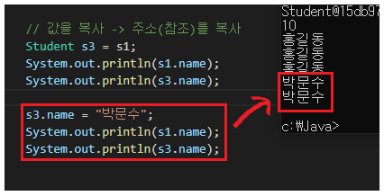 이렇게 s3을 선언하면 값을 복사하는 것이 아닌 주소(참조)를 복사하는 것이 된다.