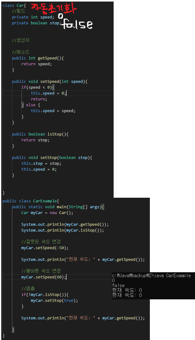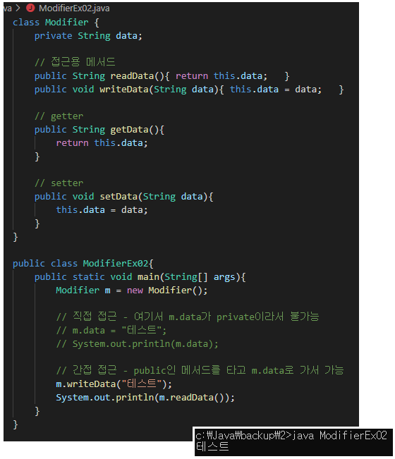 메소드를 통해서 필드에 접근할 수 있다. 왜? 메소드는 제어문이 있기 때문에 필터링이 된다.