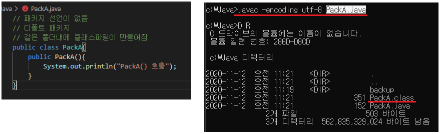 - 패키지 선언이 없으면 디폴트 패키지로 같은 폴더내에 클래스 파일이 만들어진다.
