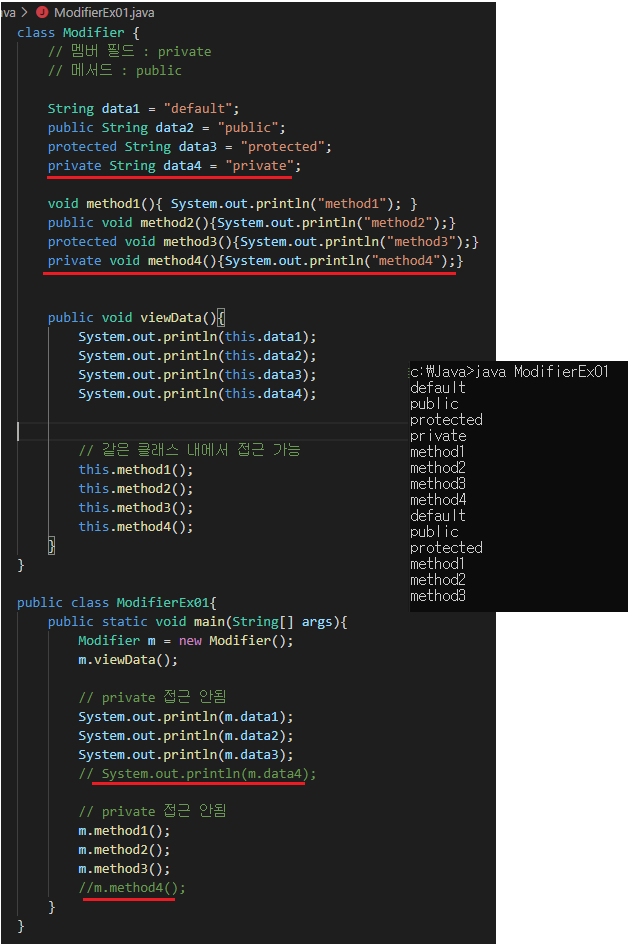 같은 클래스 내에서의 접근은 무조건 허용이다. ex) 같은 클래스 내의 메소드에서 멤버변수 호출 항상 가능