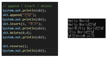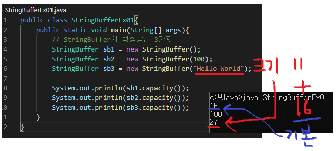 StringBuffer sb3 = new StringBuffer("Hello World"); // 문자열 할당