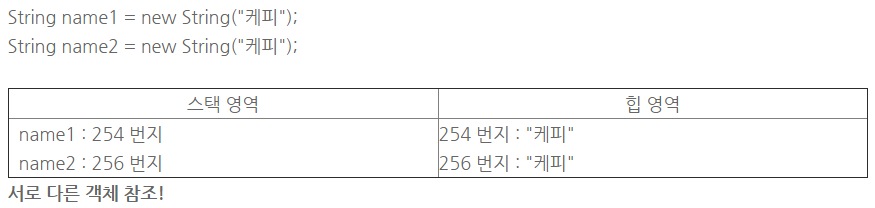 - new 연산자를 사용해서 직접 String 객체를 생성 할 수 있다. (서로 다른 객체) (new 연산자는 힙 영역에 새로운 객체를 만드는 객체 생성 연산자)