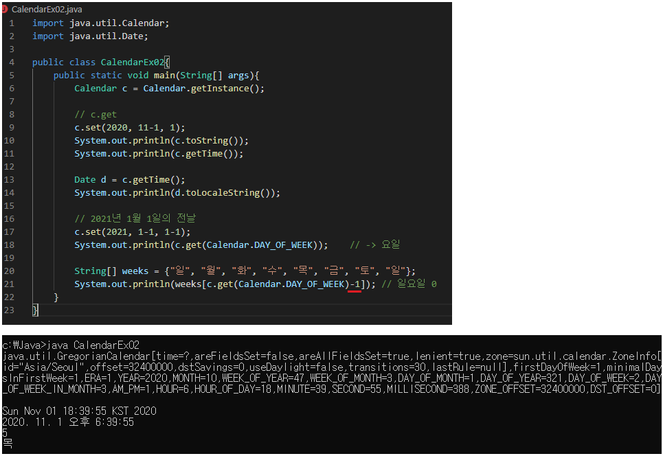 2-2. 특정 날짜 요일 출력하기 ( Date 클래스 사용 )