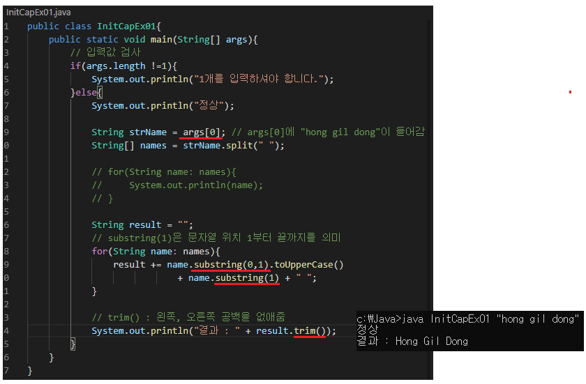 → args[]사용하여 문자열을 입력받고 향상된 for문과 substring을 사용한 것이 포인트다.