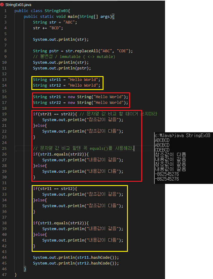 - 문자열 비교에는 꼭 equals()를 써라 아니면 참조값을 비교한다. ( str1 == str2 는 참조값 비교 )