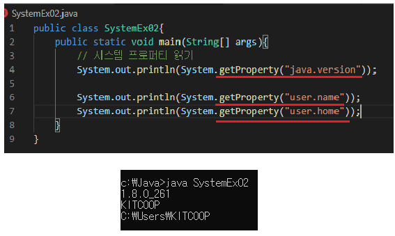 자바 프로그램은 운영체제상에서 바로 실행되는 것이 아니라 JVM 위에서 실행된다. 따라서 운영체제의 모든 기능을 자바 코드로 직접 접근하기란 어렵다. 하지만 java.lang 패키지에 속하는 System 클래스를 이용하면 운영체제의 일부 기능을 이용할 수 있다.
