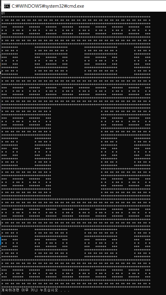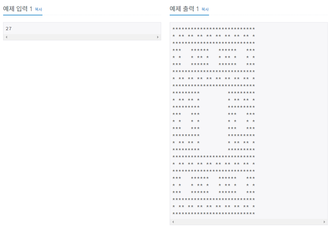 그중 빈칸이 출력되는 칸은 두가지 조건 중 하나 이상 해당 된다. [조건] 1) i와 j가 모두 3으로 나누었을 때 나머지가 1이다. 2) i와 j가 모두 가장 가까운 3의 제곱꼴로 나누었을 때의 몫이 1이다. ex) i = 9, j = 13 일때 9로 나눈 몫이 둘다 1임.